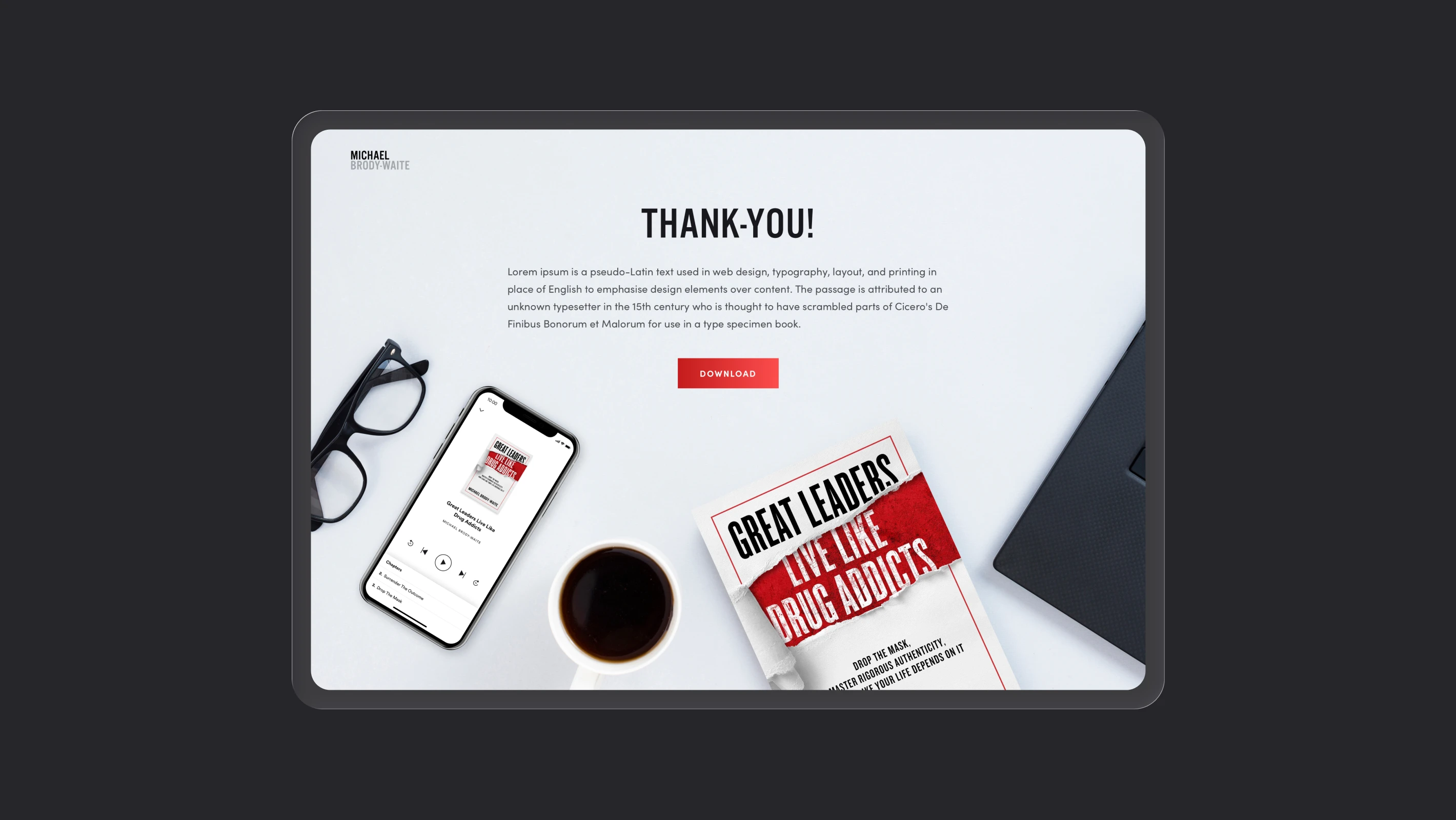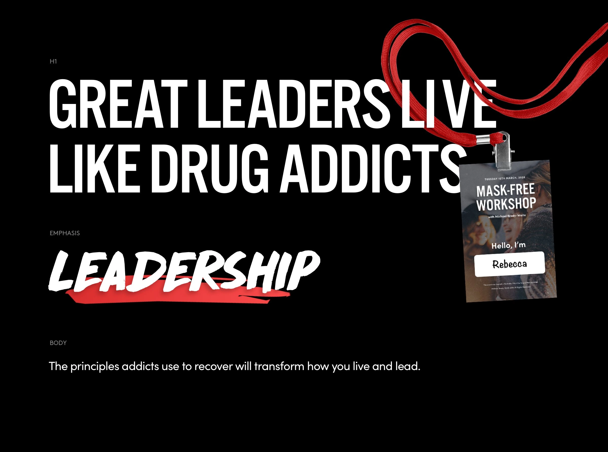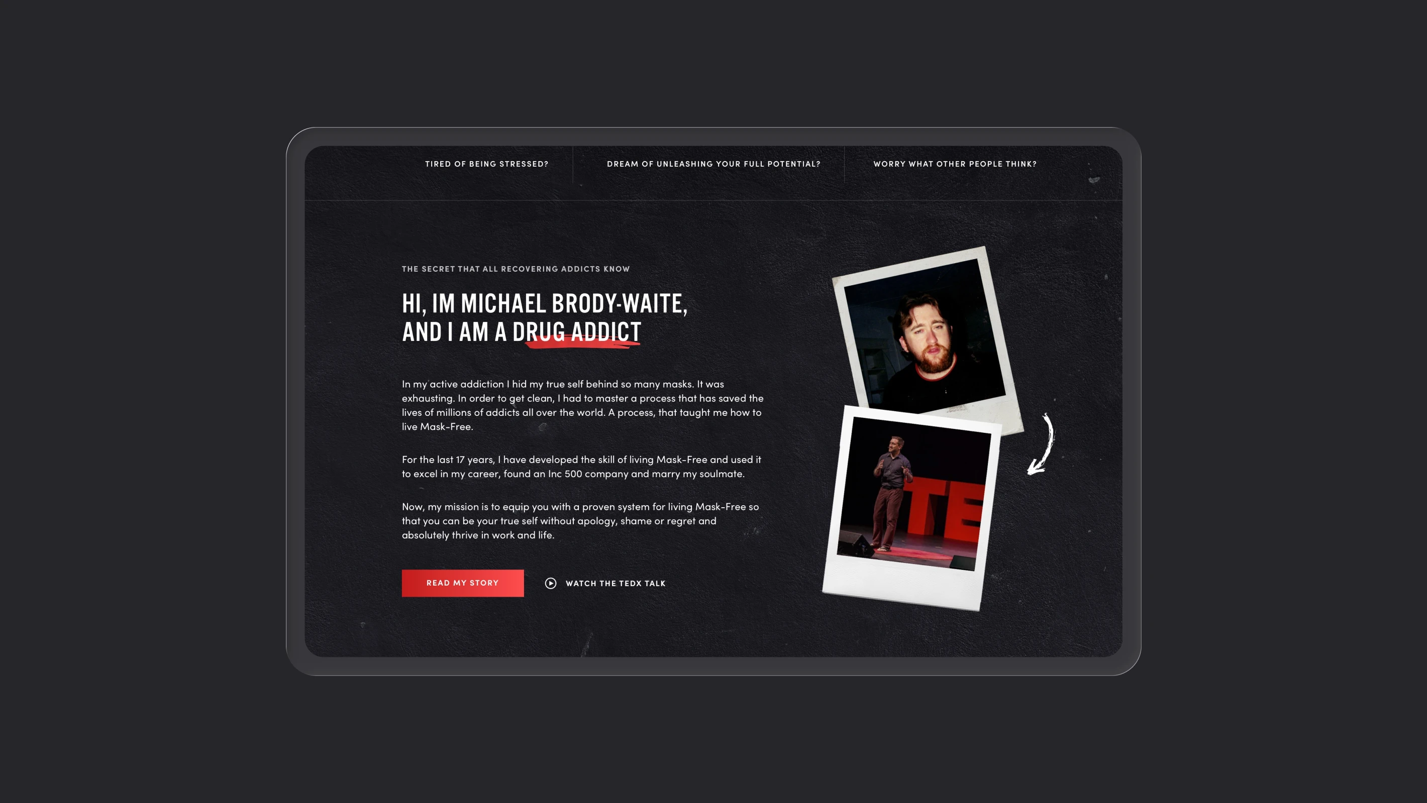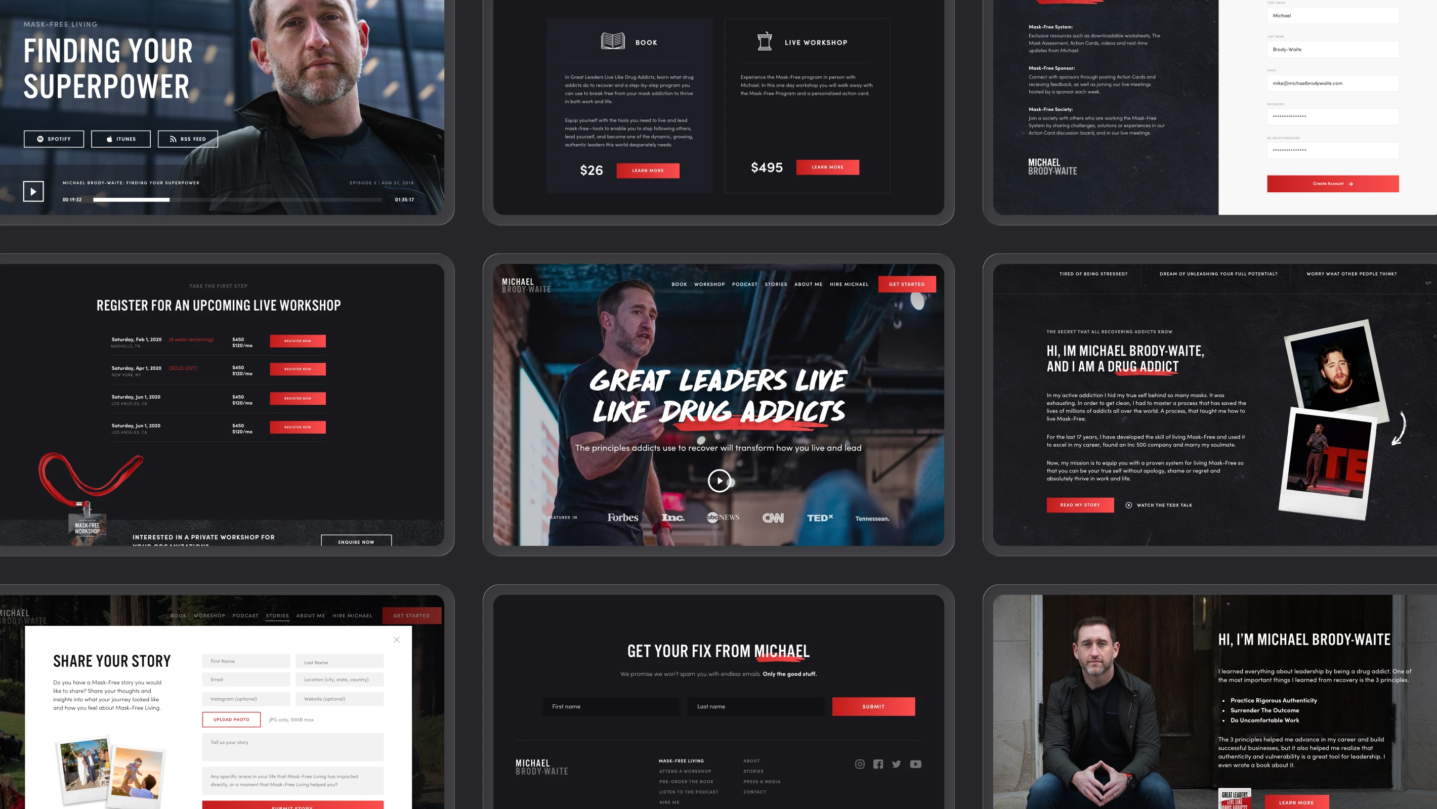 When we were researching an aesthetic for the brand, we were looking for punchy and memorable. With a background in addiction and a no-nonsense style of coaching, we selected a striking color palette paired with brazen imagery that would allow Michael to position himself as a leader in his niche and stand out from the competition.